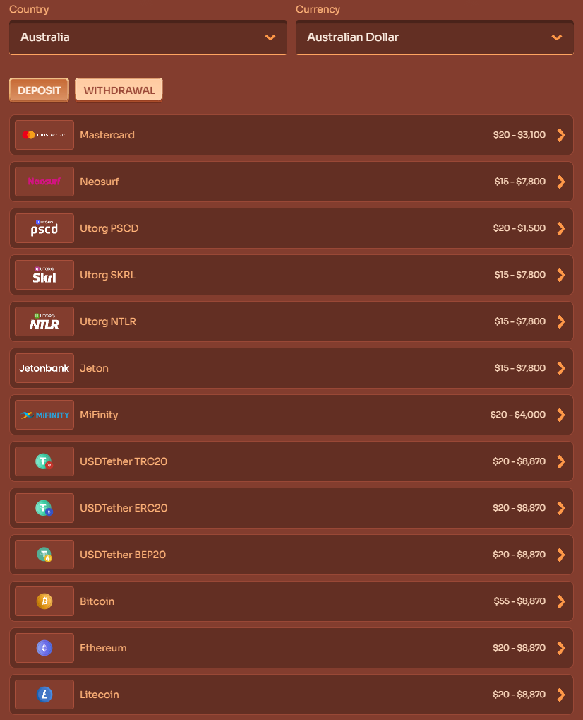 You can deposit or withdraw in multiple payment types. This includes the classic bank transfer and debit/credit cards, such as Mastercard and Visa.