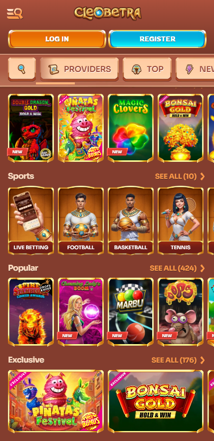 Each title runs smoothly on Cleobetra Android and Cleobetra iOS devices, with touch-friendly controls, quick loading times, and full-screen optimization. Players can browse categories by theme, paylines, or provider, or use the search bar to find specific games.